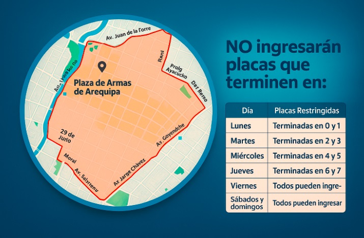 El sistema de plaqueo en Arequipa se basa en un esquema de restricción vehicular que se aplica a los vehículos de acuerdo con el último dígito de sus placas. Según la ordenanza municipal vigente, se limita el acceso al centro histórico para los vehículos particulares y taxis en días laborables, de lunes a viernes.